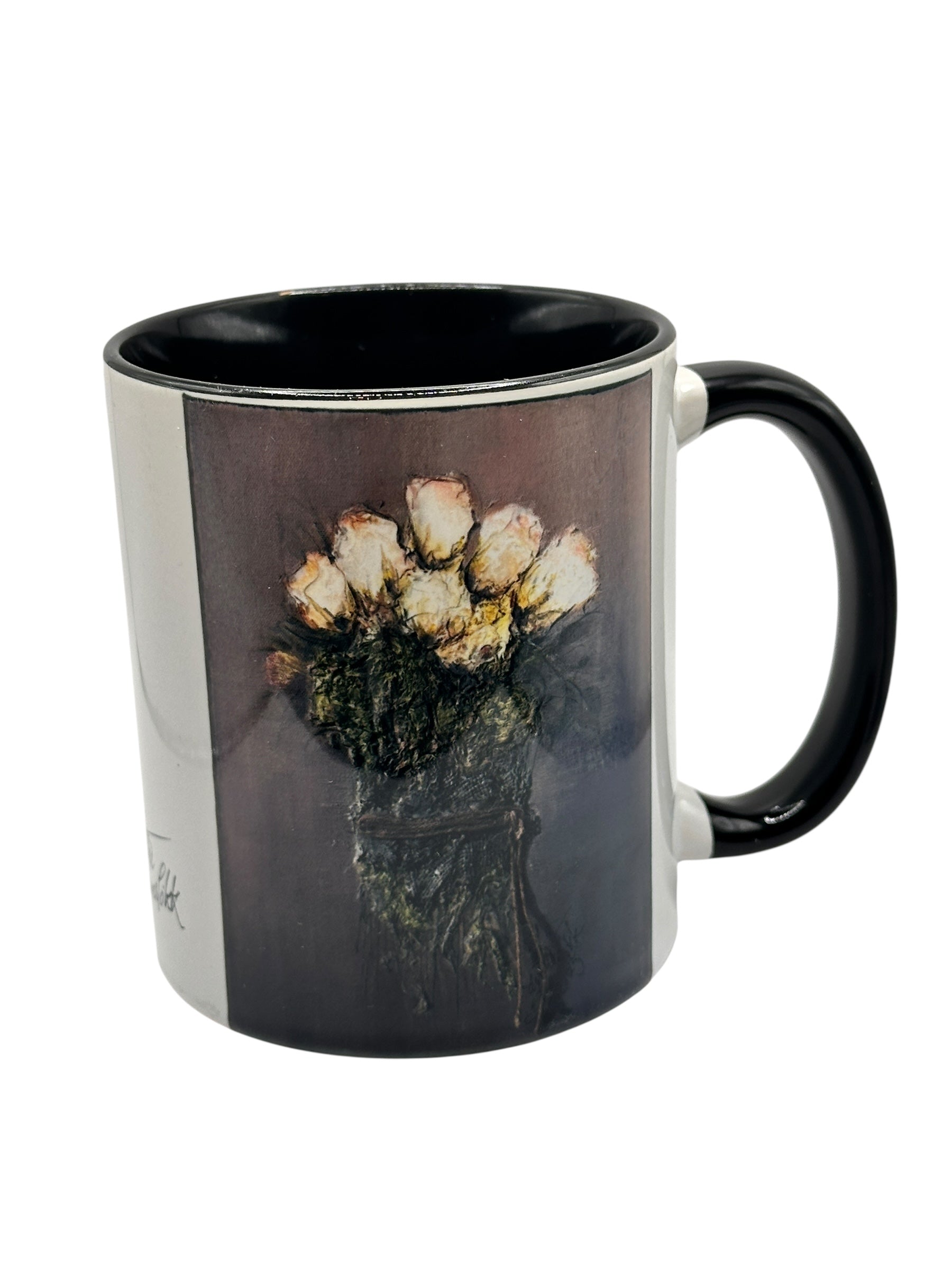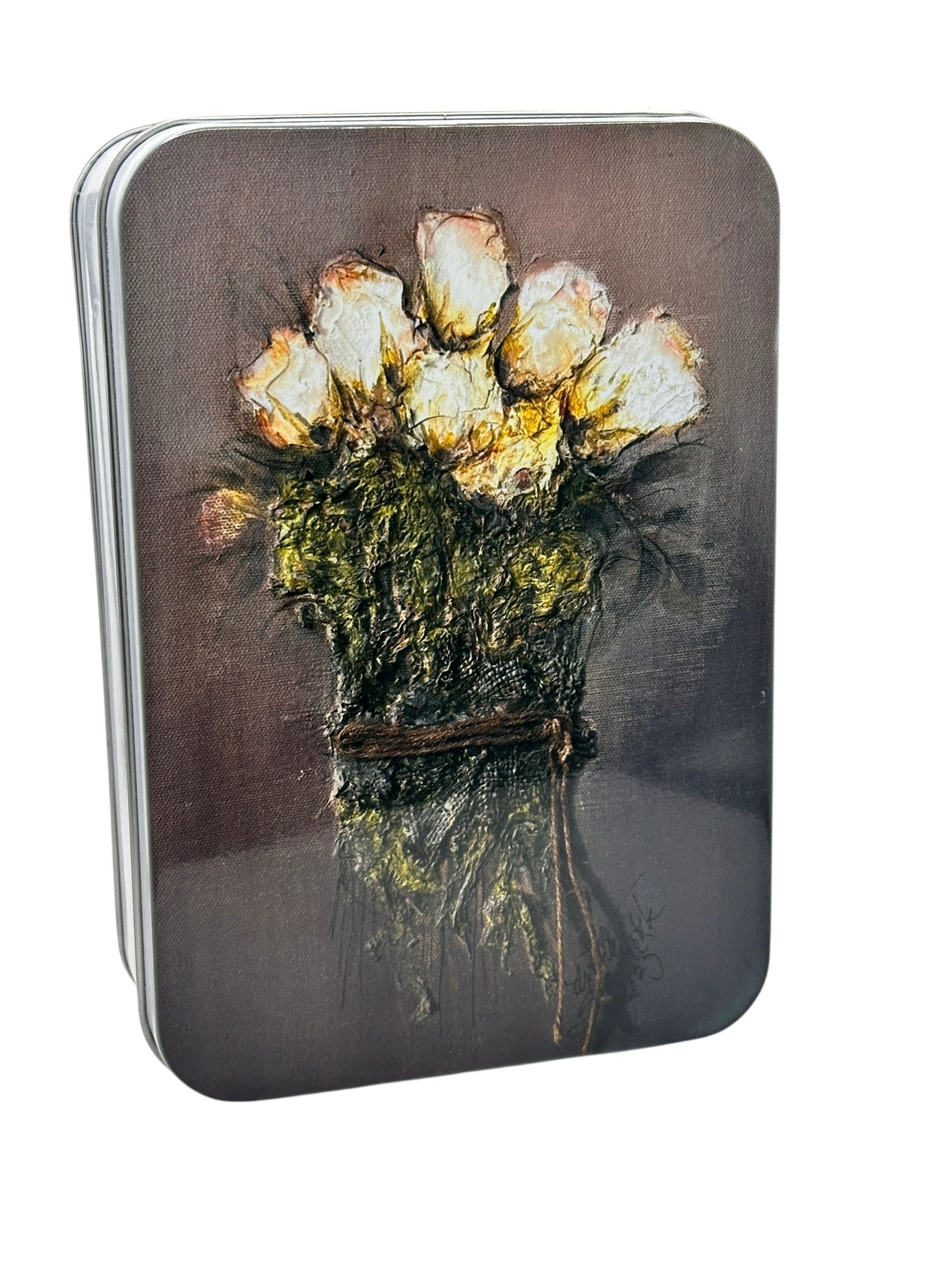 Denne flotte gavepakken består av krus, metallboks og handlenett – alle dekorert med Grethe Solemsløkk sitt vakre motiv Bundet av tid. En bukett av hvite roser bundet sammen som et symbol på kjærlighet, takknemlighet og minner som varer.