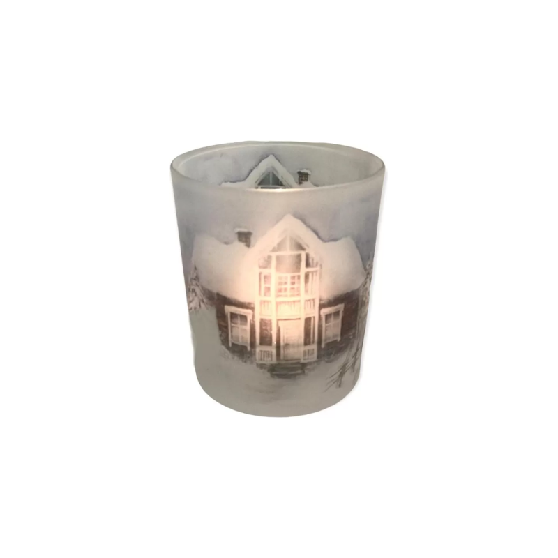Lyskopp i frostetglass med motivet "Vinterhuset".
